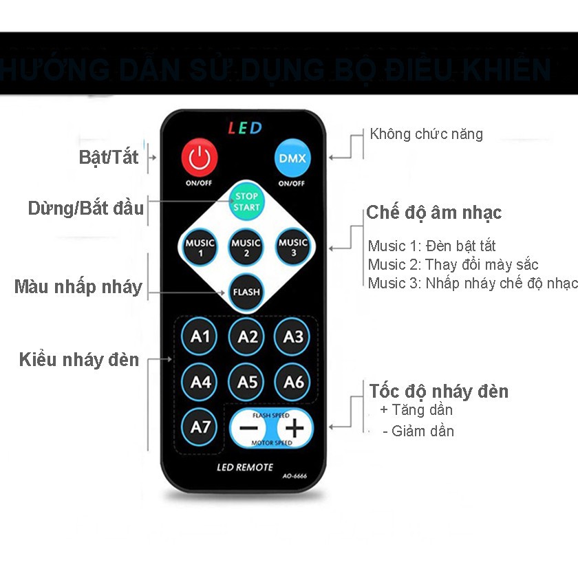 Điều khiển từ xa bật tắt chế độ nháy theo nhạc tiện lợi.