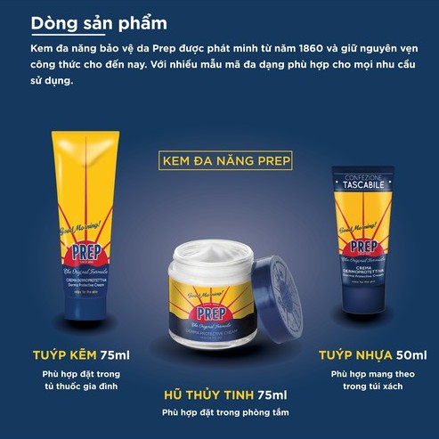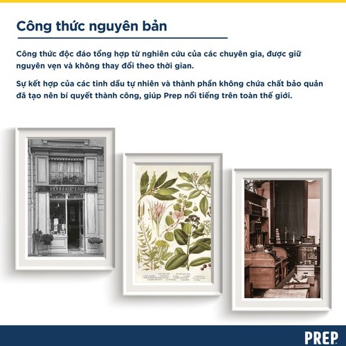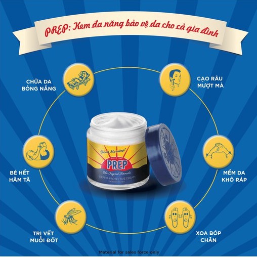 Với hơn 150 năm kinh nghiệm chăm sóc và bảo vệ làn da khỏi mọi kích ứng, Prep là kem đa năng được hàng triệu người ưa chuộng và tìm kiếm trên khắp thế giới. Công thức độc đáo của Prep là sự kết hợp của mười loại tinh dầu tự nhiên làm dịu mát và giảm các triệu chứng kích ứng da có thể dùng làm kem cạo râu cho nam giới, kem làm dịu vết muỗi đốt, côn trùng cắn, làm dịu mẩn ngứa hăm tả ở trẻ sơ sinh, kem làm dịu mát da, giảm kích ứng da, bỏng nắng, tay chân nứt nẻ, đau mỏi chân.