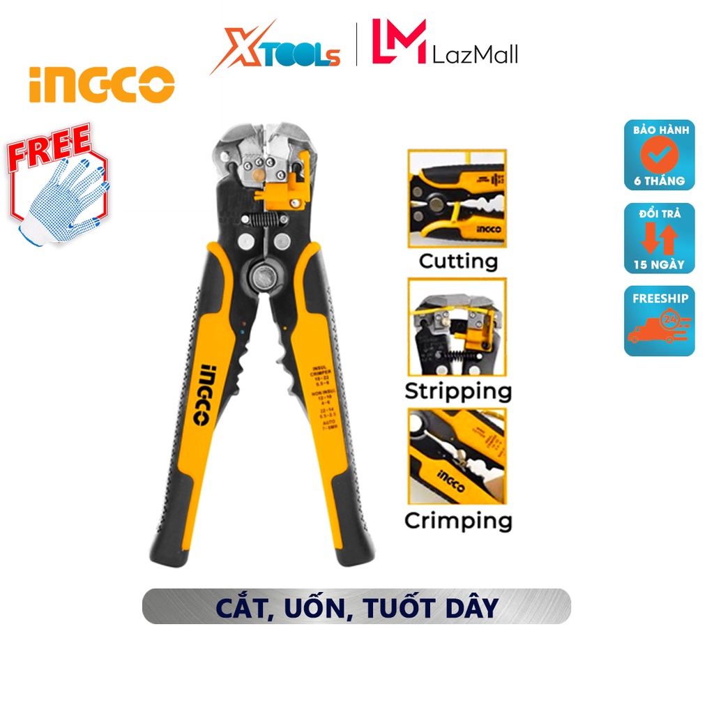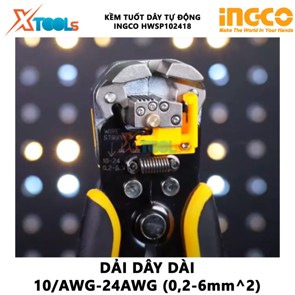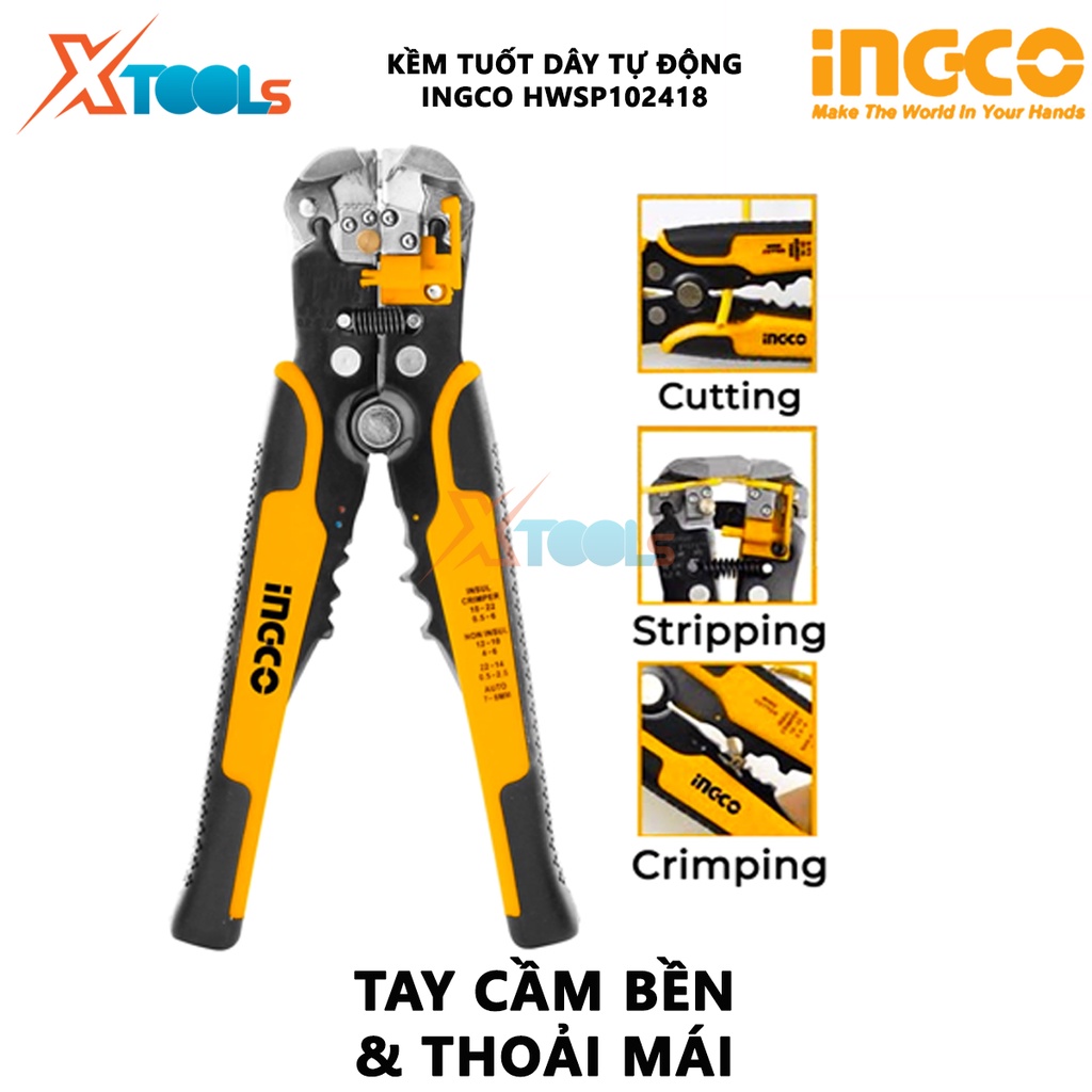 - Kềm tước dây điện tự đa năng Ingco HWSP102418 là sản phẩm Đa năng 3 trong 1: Tước, cắt và bấm Cos. Phạm vi tước là 10AWG~2AWG (0,2~6mm²) hỗ trợ tốt việc cắt dây đồng, dây nhôm