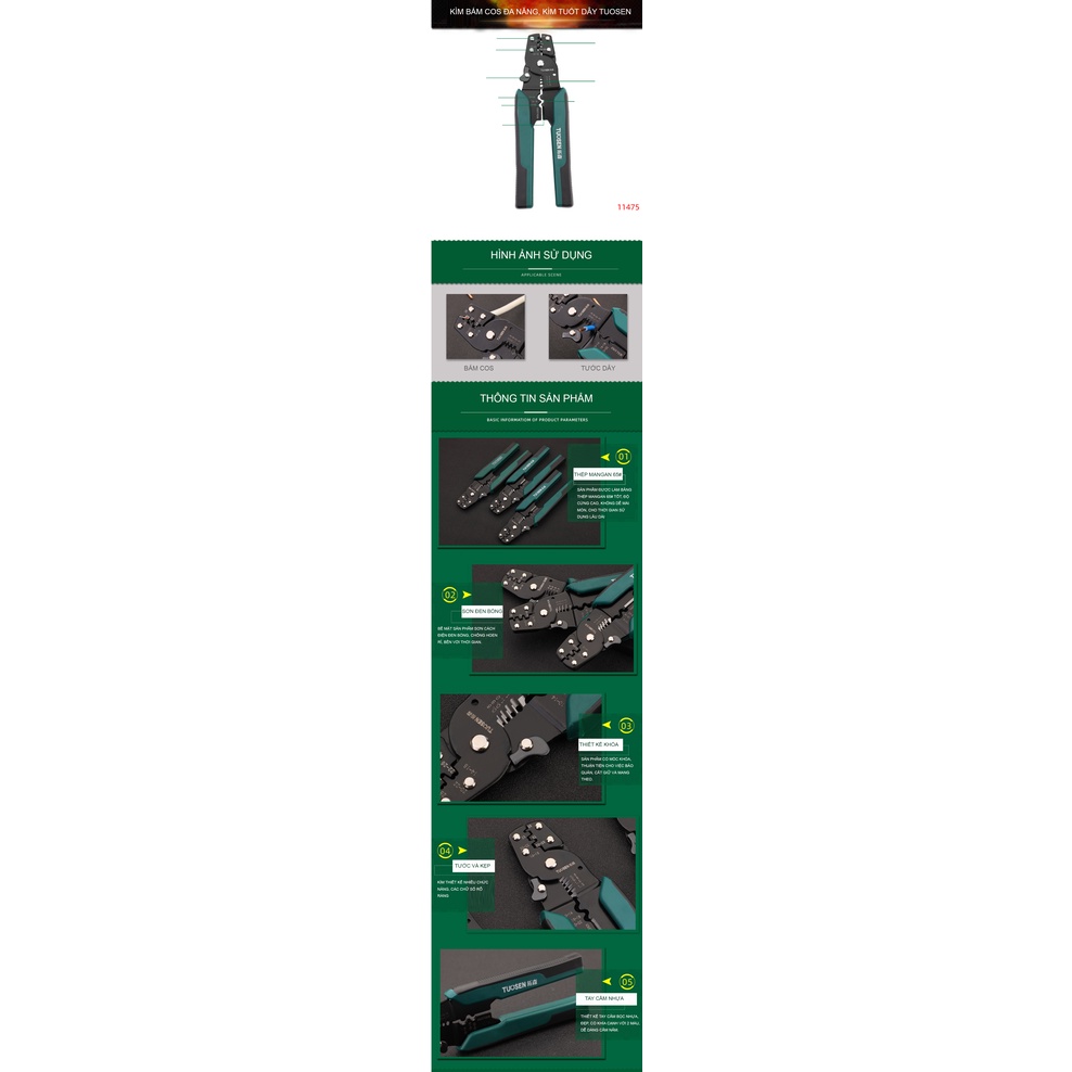 Giới thiệu Kềm tuốt dây điện 8inch, kìm tước tước dây điện 8inch, kềm bấm cos đa năng 11475 TUOSEN / Tuo Sen