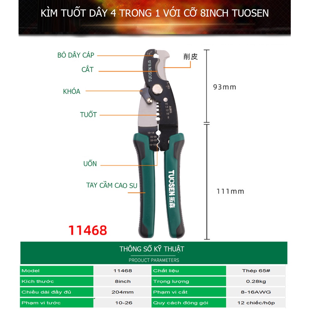 Giới thiệu Kềm tuốt dây điện, kìm tước tước dây điện 8inch, kềm bấm cos đa năng 11468 - TUOSEN / Tuo Sen