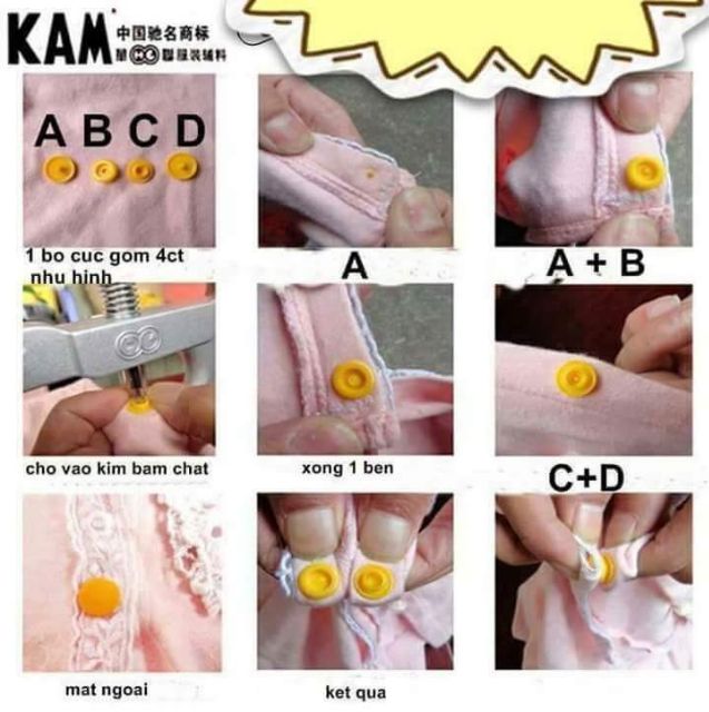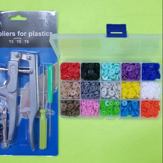 Bộ gồm kềm bấm nút nhựa và hộp nút nhựa 4 chi tiết 15 màu, dùng cho đồ trẻ em, người lớn và nút áo mưa... giá 245k/bộ gồm kềm và hộp nútKềm đợt này thêm cây dùi vải và các phụ kiện thay thế giá vẫn như cũ, các bạn nhanh tay nhé