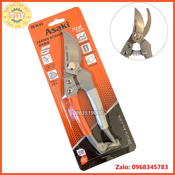 - Kéo tỉa cành Asaki là sự phối hợp độc đáo giữa màu cam tươi sáng và bạc kim sáng, đem đến cảm giác mới lạ, đặc trưng cho sản phẩm.