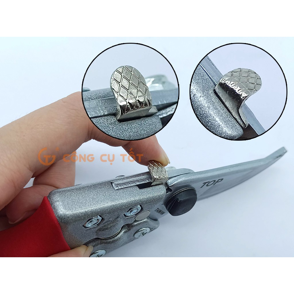 Kéo cắt cành cán nhung đỏ dài 205mm No TGP-00520 tới từ thương hiệu TOP của Đài Loan. Sản phẩm được chế tạo từ thép SK5 của Nhật Bản có khả năng chịu lực, chịu nhiệt cao, cân bằng tốt giữa độ cứng và độ bền. Kéo có khă năng tự mài sắc, đồng thời áp dụng cơ cấu lưỡi trượt cho phép cắt những cành cây to có đường kính tối đa lên tới 19mm. Kéo cắt cành TOP là "người bạn đồng hành" lý tưởng cho các nhà làm vườn chuyên nghiệp, thích hợp sử dụng trong các công việc cắt cành, ghép cành, chiết cành.Làm từ thép SK5 có độ cứng ổn định, độ bền cao, chống biến dạng