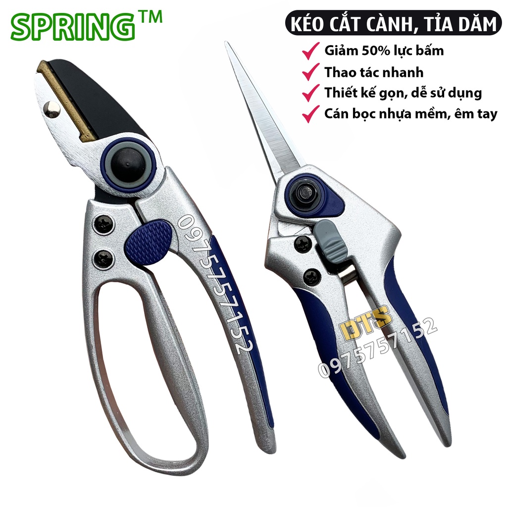 Kéo cắt cành, kéo tỉa dăm trợ lực cao cấp SPIRNG lưỡi thép Đức siêu sắc siêu bền thiết kế tối tưu tiết kiệm 50% lực bấm