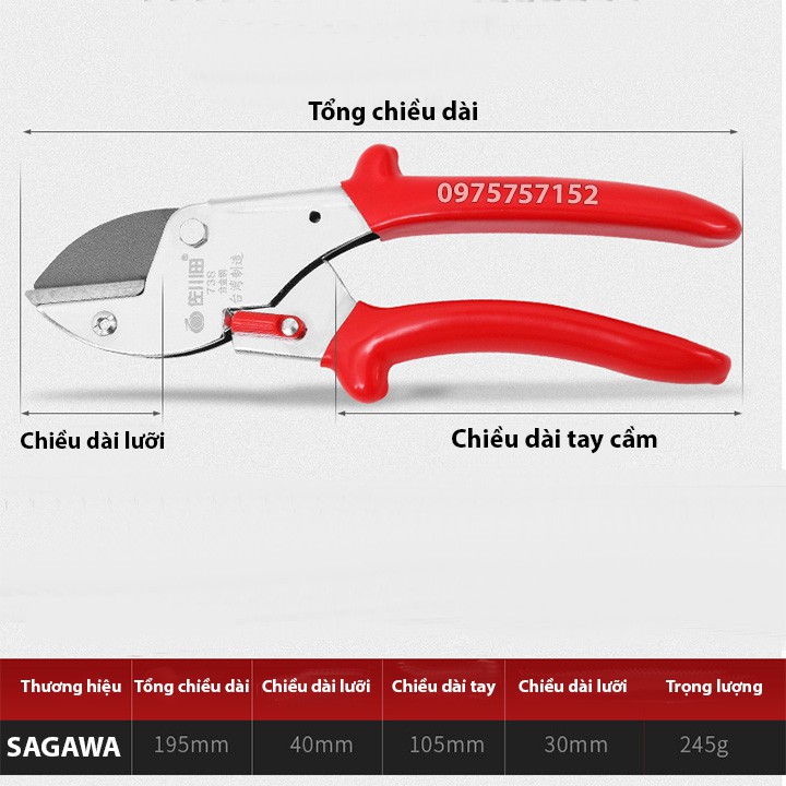 Kéo cắt cành trợ lực chuyên nghiệp SAGAWA 195mm - Cắt cành to nhẹ nhàng, thép Đức siêu cứng, siêu bền