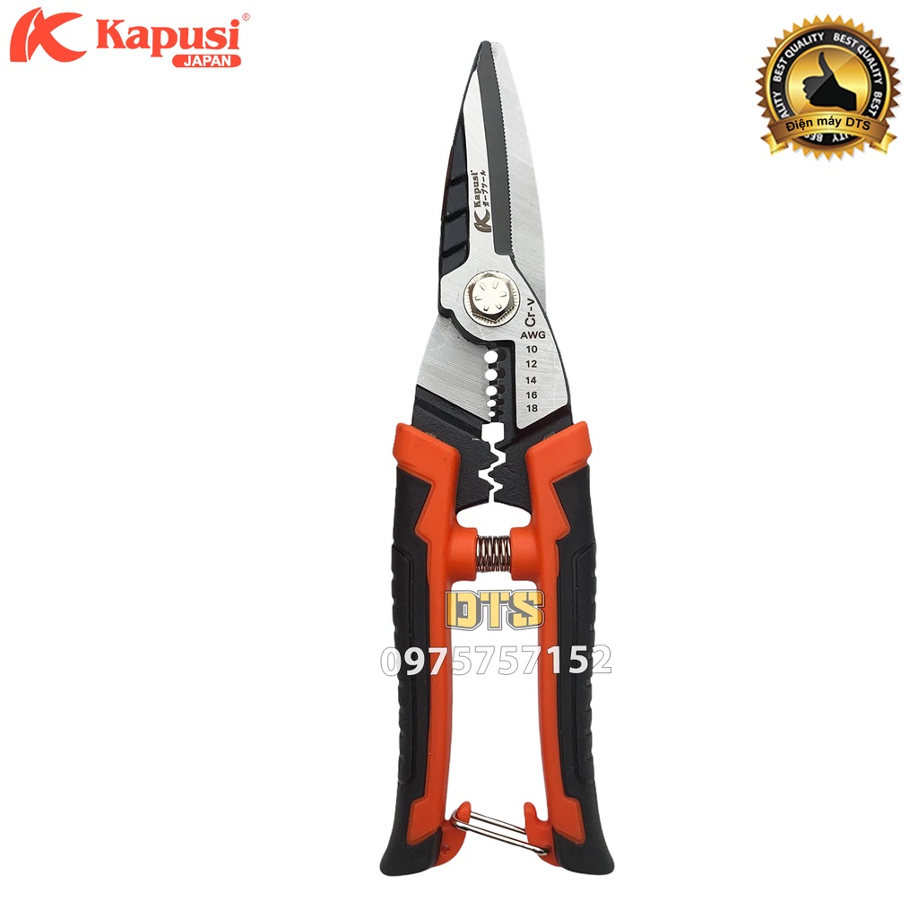 Kéo cắt dây đa năng trợ lực Nhật 3 trong 1 Kapusi JAPAN 215mm, kìm tuốt dây điện cao cấp tích hợp bấm cos thao tác nhanh
