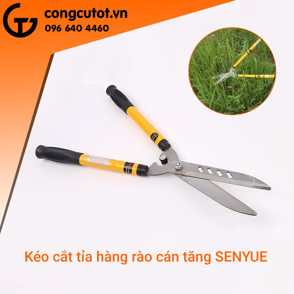 Kéo cắt tỉa hàng rào cán tăng SENYUE có lưỡi sắc. Trên lưỡi cắt có các khe thoát nhựa chống dít kéo. Với thiết kế kèm một hõm chống trượt trên lưỡi kéo có thể cắt cả các cành cây to đường kính đến 15mm. Tay cầm bọc cao su dạng khớp nối có thể tăng chiều dài kéo.Lưỡi kéo sắc bén, vết cắt nhanh, ngọt