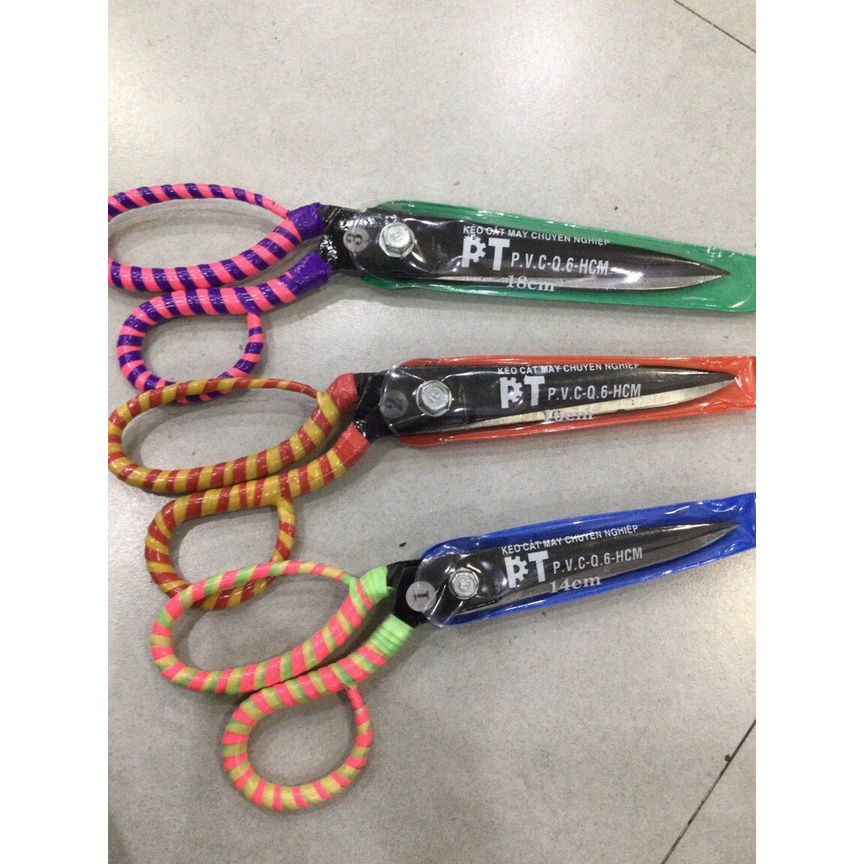 Kéo cắt vải PT có 3 size số 1 chiều dài lưỡi 1 tất 4, số 2 chiều dài lưỡi 1 tất 6, số 3 chiều dài lưỡi 1 tất 8