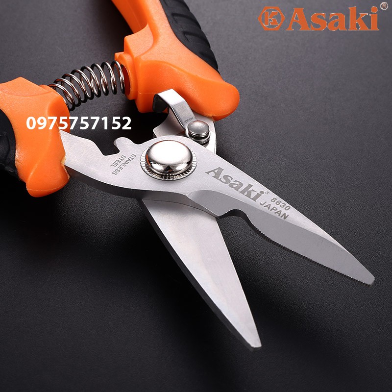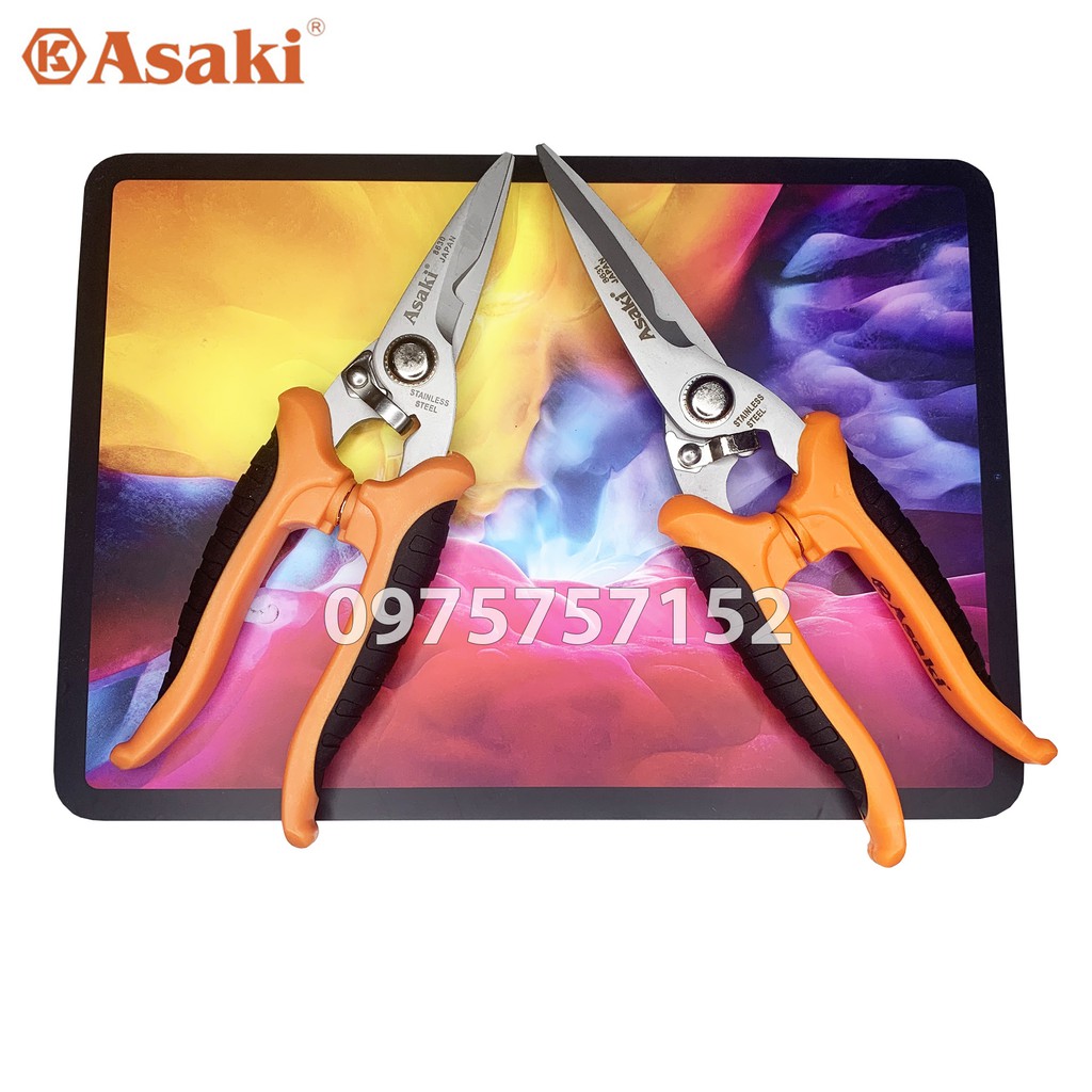 Kéo đa năng lưỡi Inox mũi thẳng Asaki JAPAN, kéo cắt lon, cắt giấy bìa dây, tuốt vỏ dây điện, cắt nhựa, tỉa cành cây