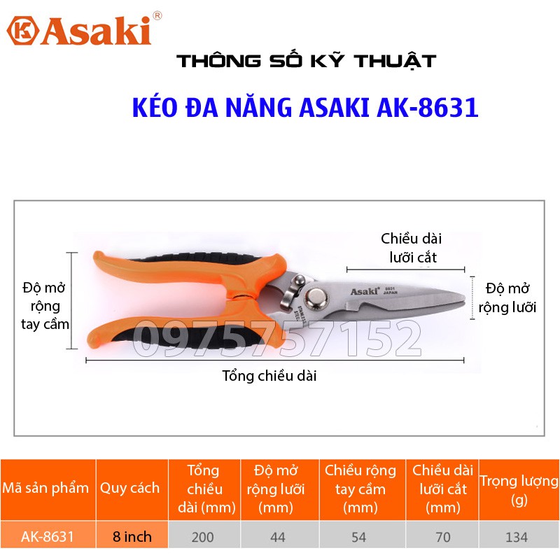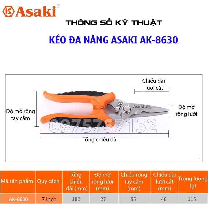 Kéo đa năng hãng Asaki là dụng cụ cắt được vật dày mà kéo văn phòng thông thường không thể cắt được hoặc nếu cắt được thì cũng làm kéo nhanh hỏng. Kéo còn được dùng cắt tỉa cây như kéo cắt tỉa bonsai, kéo cắt được vỏ lon nước ngọt lon bia hay cắt được kim loại có tính chất tương tự. Kéo đa năng cắt được nhựa tấm mica hay dây nhựa gàn thùng hàng.Kéo đa năng Asaki còn có lõm tuốt vỏ dây điện, là sản phẩm các kỹ thuật viên cần có một cây để sẵn trong túi khi làm việc.