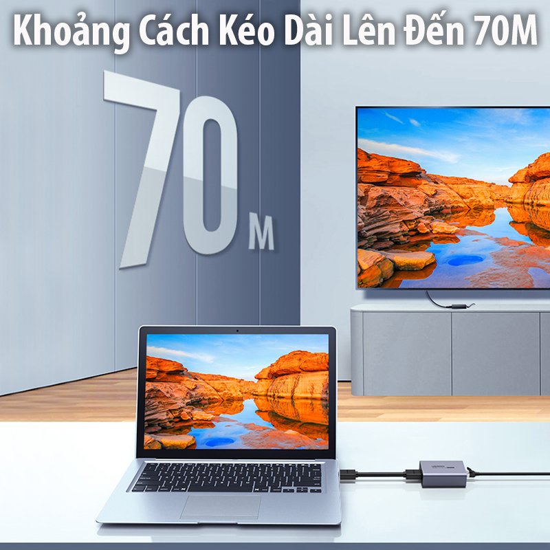 Giới thiệu Bộ kéo dài HDMI qua Lan 70 met dây mạng Cat5/Cat6 Cao Cấp Ugreen 20519 CM445 (Bộ 2 cái+Adapter) Chính Hãng