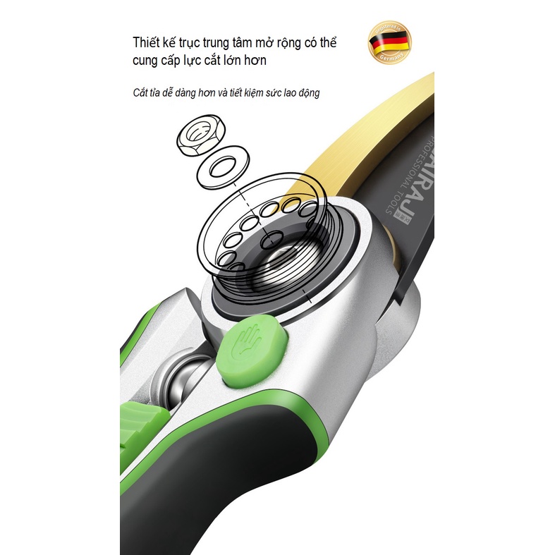 Kéo, Kìm Cắt Tỉa Cành (Cao Cấp)- Thiết kế trục trung tâm mở rộng giúp tăng lực cắt => cắt được cành cây có độ cứng cao hơn