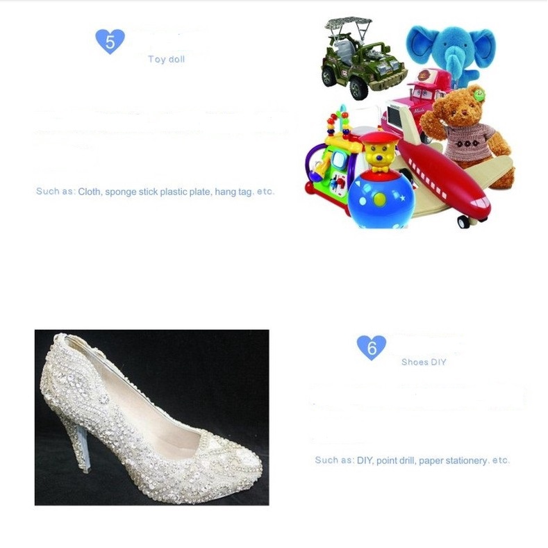 - Dùng dán thủ công mỹ nghệ, trang trí, giầy, dép, nhưa, kim loại, gốm sứ, gỗ, đồ chơi, búp bê, vải, tấm nhựa xốp, thẻ đeo, văn phòng phẩm, giấy...