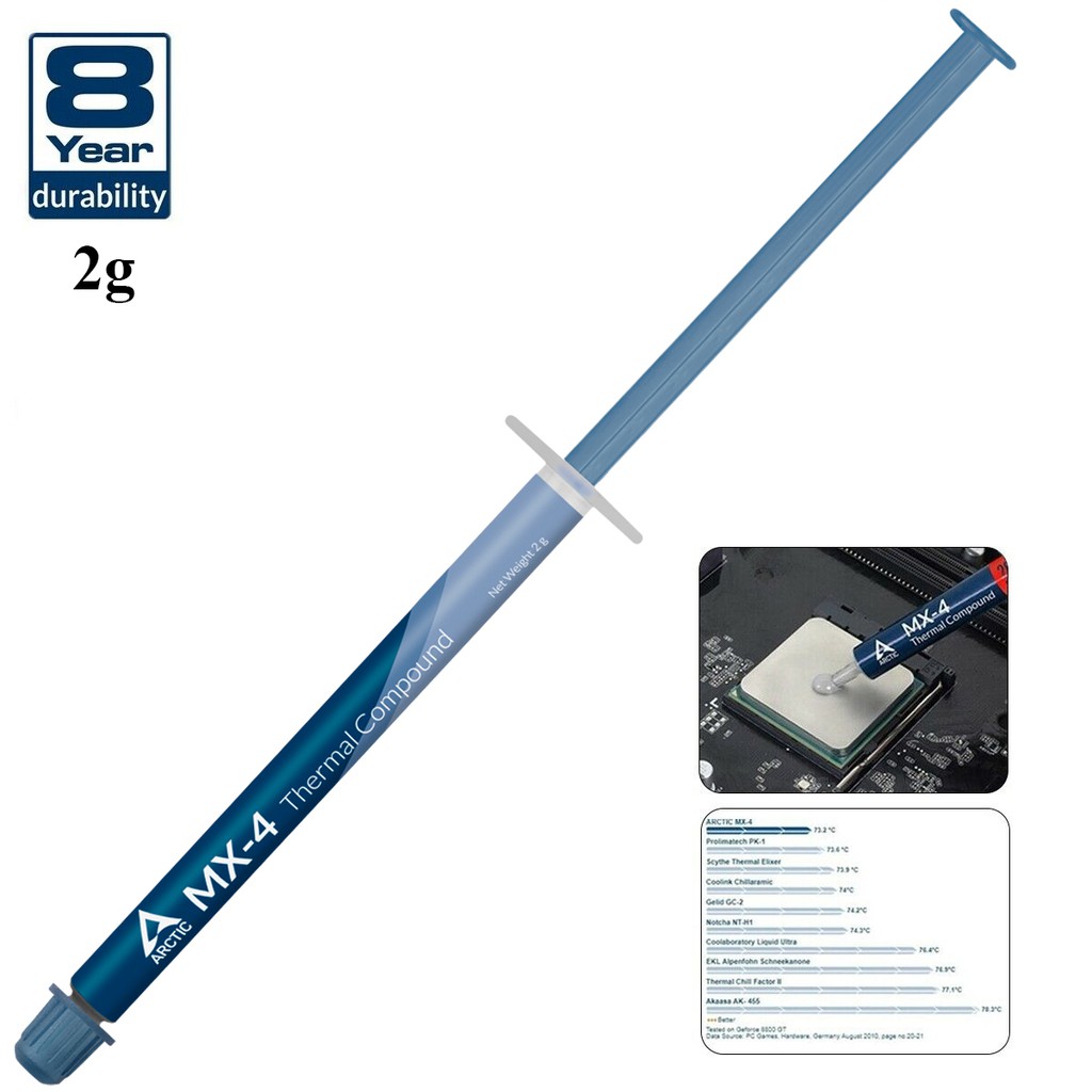 Arctic với size 2gram dùng được 8 lần. 4gram sử dụng được 15 lần, 8gram sử dụng được 30 lần và 20g sử dụng được 80 lần. Arctic Mx 4 có độ dẫn nhiệt lên đến 8.5w/mk và Mx 5 10wmk