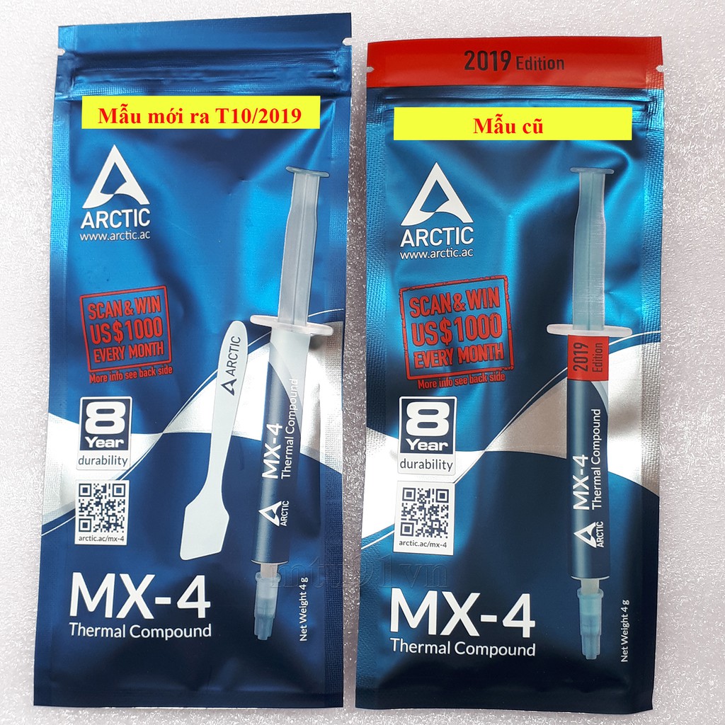 Từ T10/2019 Arctic MX4 4g phát hành bao bì mới (shop chụp ở hình 2 và 3 ), và có thêm que trét keo sẵn trong túi zip, trong khoảng thời gian T11/2019 shop gửi 1 trong 2 mẫu ngẫu nhiên do tồn kho vẫn còn 1 ít.