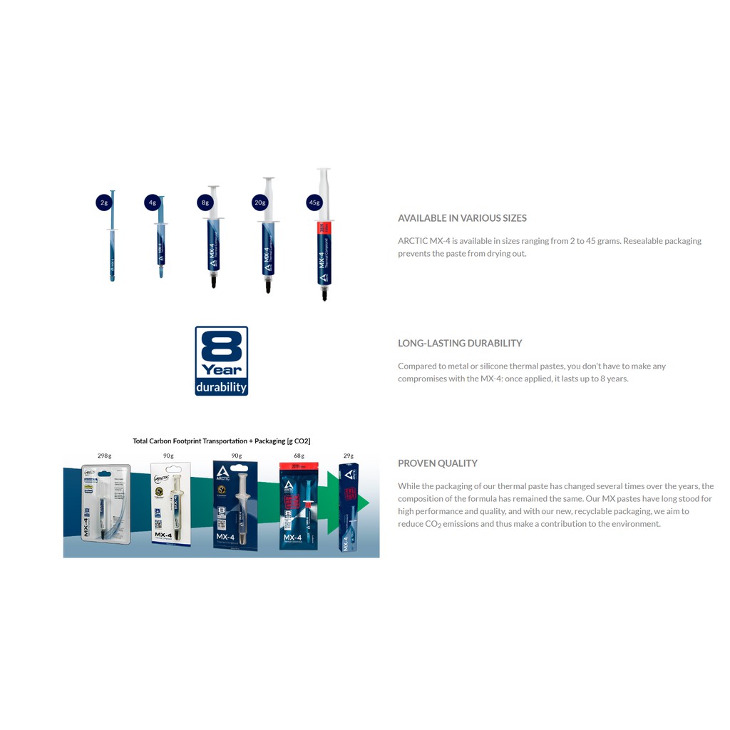 - Dòng sản phẩm được bán rất nhiều cho PC gamer tại Swizerdland.Arctic MX 4 với size 4gram sử dụng được 15 lần, 8gram sử dụng được 30 lần và 20g sử dụng được 80 lần. Để đạt được số lần bôi này, người bôi phải rất khéo léo bôi tiếp xúc, không bôi quá nhiều tràn mép GPU / GPU khi ốp tản lên.... Arctic Mx 4 có độ dẫn nhiệt lên đến 8.5w/mk.