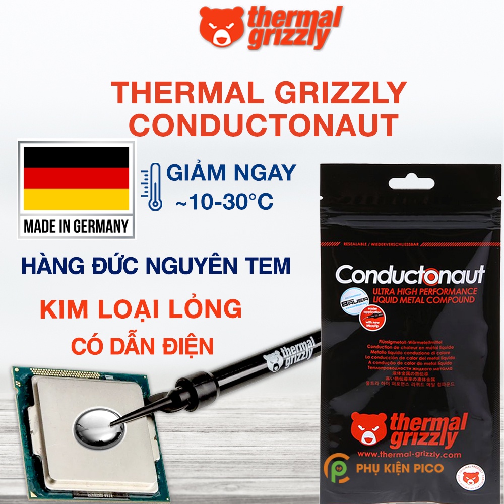 - Keo tản nhiệt kim loại lỏng Thermal Grizzly Conductonaut độ dẫn nhiệt lên tới 73w/mk gấp 6 lần so với Thermal Grizzly Kryonaut là 12.5w/mk, Keo Thermal Grizzly Conductonaut hiệu quả hơn keo Arctic MX4 gấp 9 lần độ dẫn nhiệt của Arctic MX4 chỉ là 8,5W/mK.