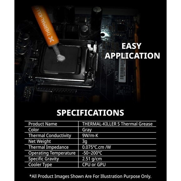 - THERMAL-KILLER S là Mỡ tản nhiệt có hiệu suất tuyệt vời. Cho dù đó là Làm mát bằng không khí hay chất lỏng, Ứng dụng CPU hoặc GPU, Ép xung hay Bất kỳ hệ thống PC nào.