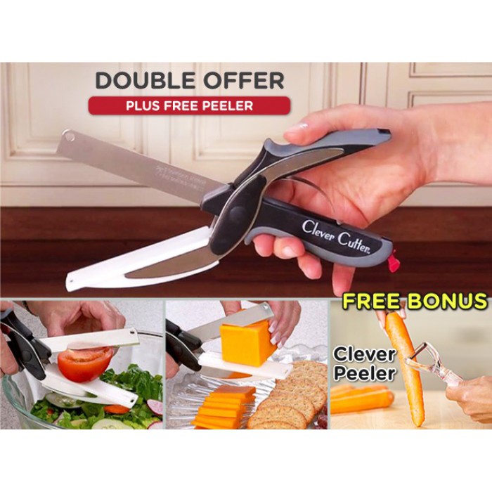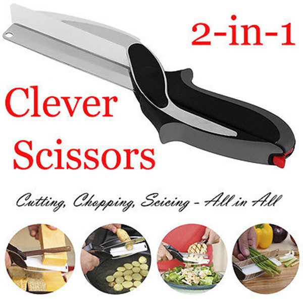 Kéo thông minh Clever cutter 3 trong 1 thay thế cho cả dao và thớt giúp bạn cắt cà rốt, bổ khoai tây, cắt bánh mì, cắt thịt, cắt bơ, cắt lát hành tây, cắt ngô/bắp, cắt hành, cắt xả, thậm chí cả ngô nữa, … và rất nhiều loại rau củ thực phẩm khác chỉ trong 1 sản phẩm.- Sản phẩm tiết kiệm tối đa thời gian cho công việc bếp núc. Cắt nhanh hơn, rửa nhanh hơn so với dùng dao thớt.