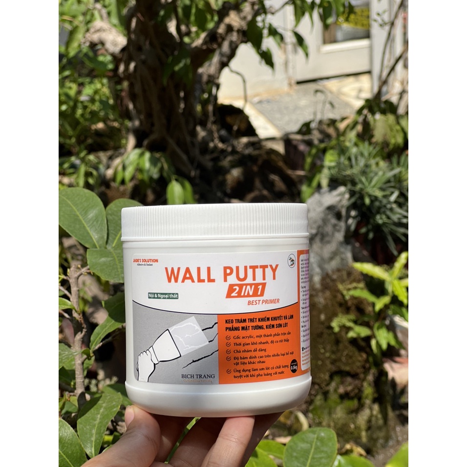 Wall Putty (2in1) là sản phẩm mastic dạng trộn sẵn gốc acrylic, được sử dụng để trám trét, sửa chữa và làm phẳng các khiếm khuyết trên bề mặt kiến trúc (tường trần gạch, xi măng, thạch cao…) như lỗ đinh, vết nứt chân chim, những chỗ tiếp giáp giữa tường và khung cửa và cửa sổ. Đặc biệt, pha loãng với 40% nước sẽ thành sơn lót nội - ngoại thất. Thành phần gôm hỗn hợp Acrylic polymer, bột khoáng, nước, phụ gia hoạt tính.