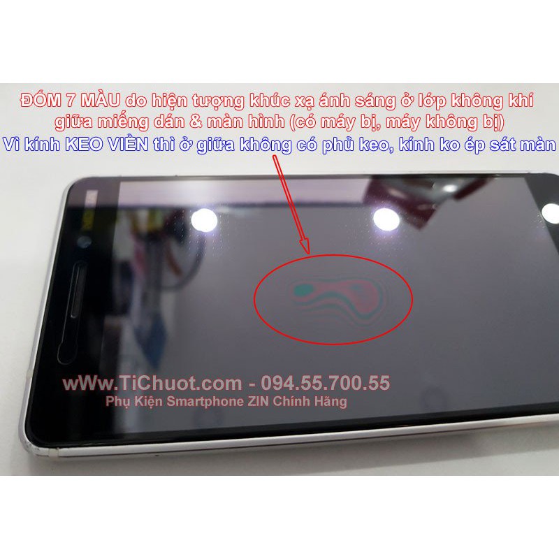⚡ Do kính cường lực dạng KEO VIỀN nên chỉ có keo ở phần viền màu xung quanh cạnh kính, phần giữa màn hình ko có keo (chỉ có ma trận chấm cảm ứng), tức là sẽ có lớp không khí ở giữa kính & màn hình ĐT nên tùy máy khi dán vào sẽ có hiện tượng khúc xạ ánh sáng tạo thành 1 đốm 7 màu như vệt dầu loang (đốm to hay nhỏ & vị trí xuất hiện có thể khác nhau giữa các máy; có máy bị, có máy bình thường).
