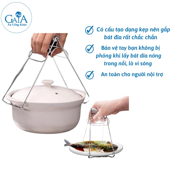 + Với thiết kế có cấu tạo dạng kẹp nên gắp bát đĩa rất chắc chắn, tạo cảm giác yên tâm không lo bị rơi. Dùng để gắp bát đĩa nóng khỏi nồi hấp, lò vi sóng... Thiết kế thông minh chuyên dùng để kẹp chén, dĩa tô, nồi khi nấu và hấp thức ăn chống nóng và bỏng tay. Không những gắp sản phẩm ra khỏi nồi và bếp mà còn có thể sử dụng để kéo tô và dĩa ra khỏi lò vi sóng. Bạn cũng có thể sử dụng tay cầm này để mở nắp nồi hoặc bắc chảo, nồi ra khỏi bếp nóng.