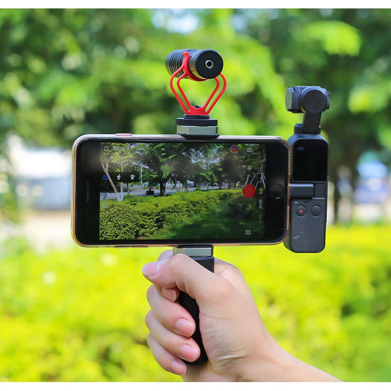 Bộ gắn máy điện thoại và DJI Osmo Pocket 1 và 2, chất liệu kẹp hợp kim CNC đẹp chắc chắn. Tích hợp khe gắn đèn LED hoặc Mic thu âm. Trọn bộ sản phẩm kèm sẵn chân đế mini vừa làm tay cầm vừa có thể xòe ra làm 3 chân rất tiện lợi.