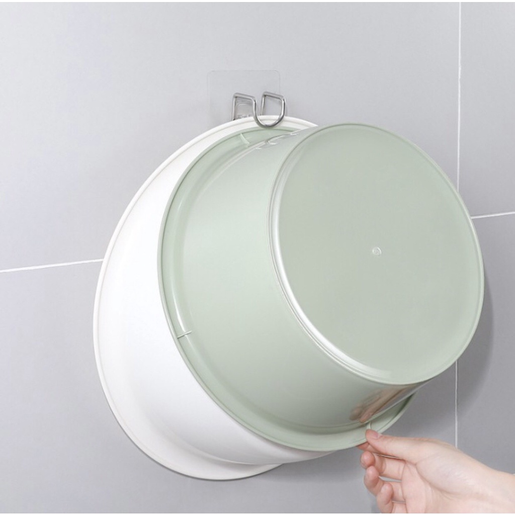 - Có móc giữ hình chữ L để gài nhiều thau chậu cùng lúc, treo lên tường gọn gàng, các chậu có thể cùng cỡ hoặc khác cỡ, miễn là lồng vào nhau được, tạo nhiều không gian thoáng dưới mặt sàn nhà tắm , chịu tải 3-5kg.