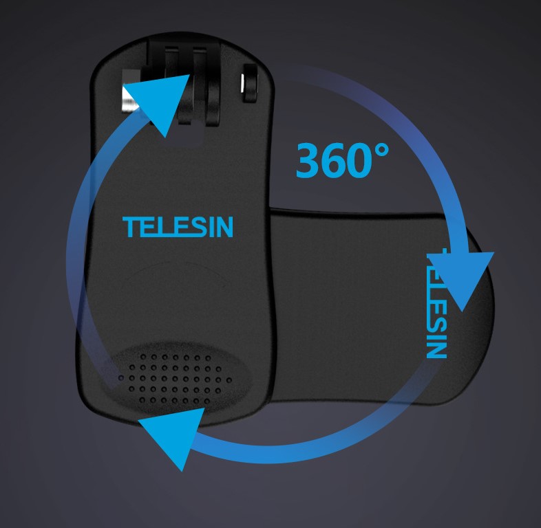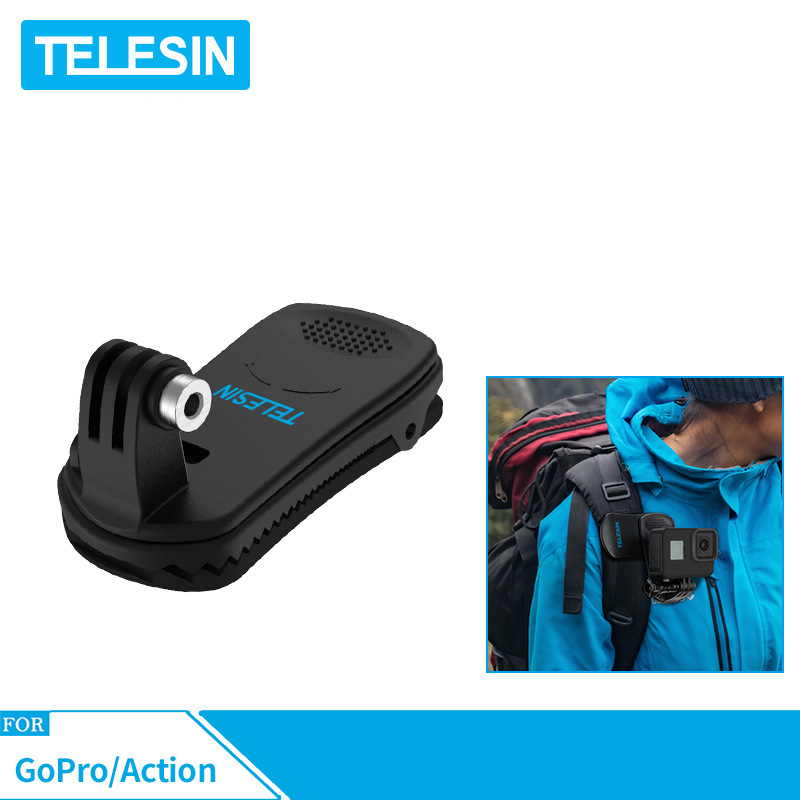 Kẹp dây Balo gắn GoPro Telesin. Dùng kẹp trực tiếp máy lên các dây đeo vai balo, nón lưỡi trai … Kẹp Telesin có thể chỉnh quay 360 độ. Kẹp dây Balo gắn GoPro 6 Telesin có lực kẹp mạnh giữ máy rất chắc chắn và ổn định khi quay video hành trình.
