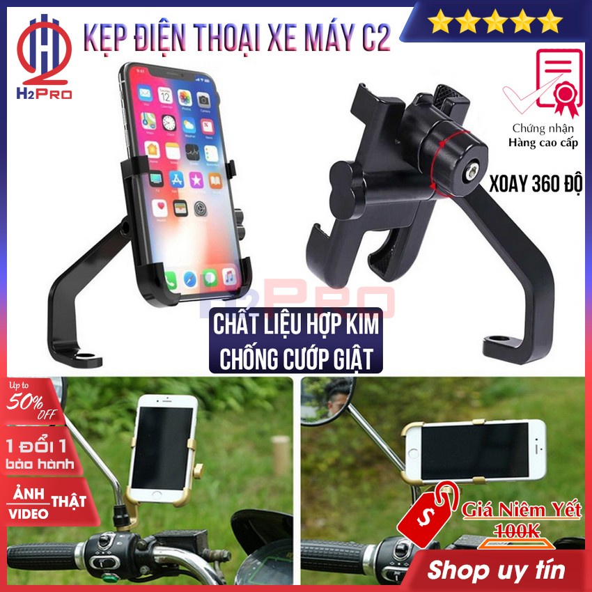 Kẹp điện thoại xe máy C2 H2pro cao cấp-chất liệu hợp kim-xoay 360 độ-chống cướp giật (1 bộ), kẹp điện thoại cho xe máy giá rẻGiá đỡ điện thoại xe máy C2 là mẫu đỡ điện thoại đang được cánh tài xế công nghệ sử dụng nhiều và phổ biến hiện nay. Giá kẹp điện thoại C2 gắn chân kính chiếu hậu xe máy, được làm bằng chất liệu hợp kim nhôm inox cao cấp, chống rung, chắc chắn, chống giật, đảm bảo an toàn cho điện thoại khi di chuyển. Kẹp điện thoại xe máy C2 H2pro hiện đang được Thế giới công nghệ H2pro phân phối và bán lẻ, giao hàng tận nơi trên toàn quốc.