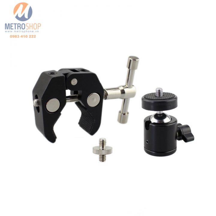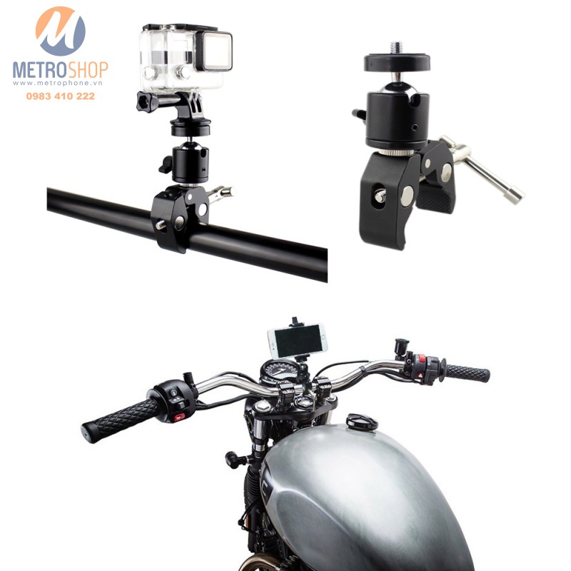 Kẹp gắn điện thoại và Action Cam máy ảnh trên xe. Bộ phụ kiện không thể thiếu trong những chuyến đi chơi bằng xe máy. Đầu Ball chuẩn ren 1/4″ có thể gắn các máy Action Cam như GoPro, Xiaomi Yi , SJ Cam, Sony … Ngoài ra cũng có thể gắn máy ảnh cỡ vừa và nhỏ để quay hành trình. Có thể tùy chỉnh góc quay 360 độ một cách dễ dàng.
