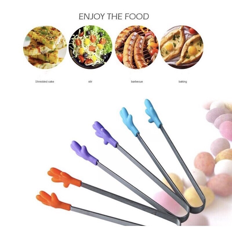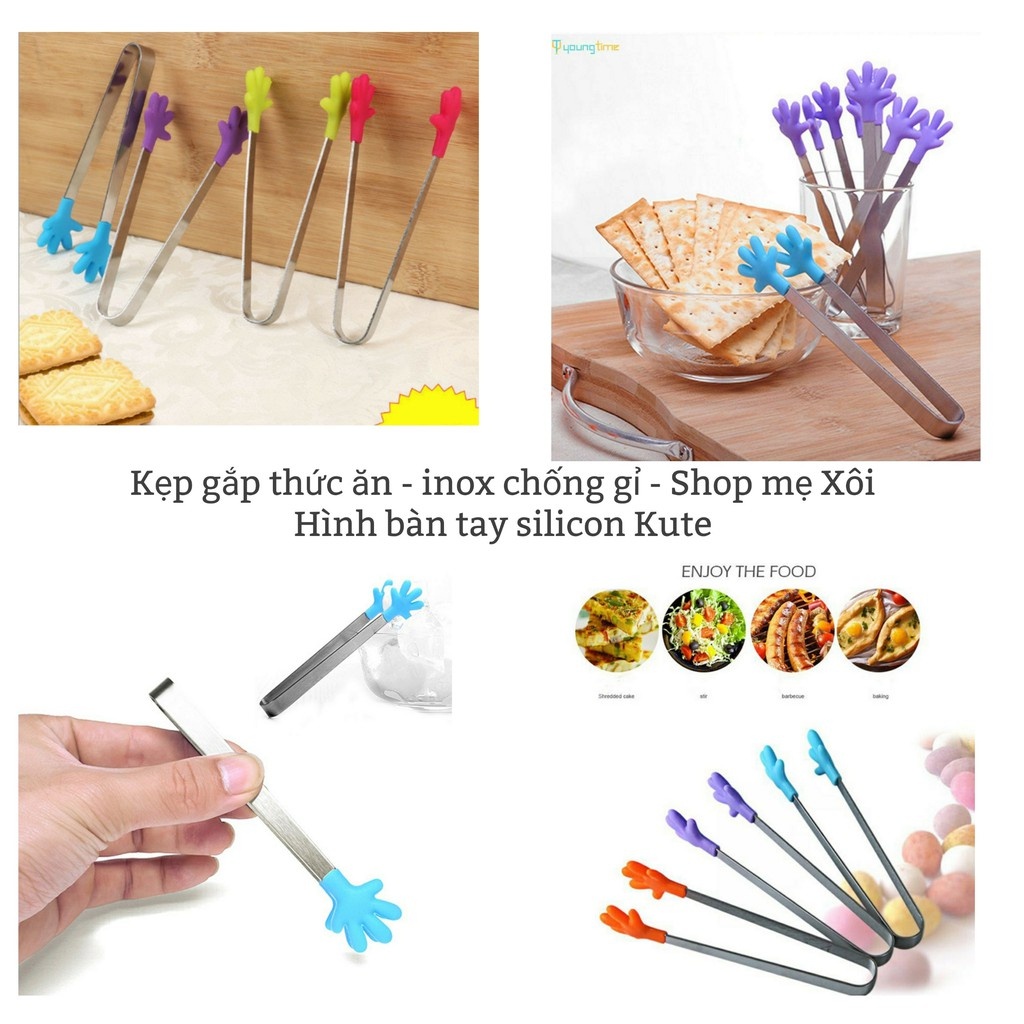 Kẹp gắp thức ăn được làm bằng thép không gỉ với đầu bằng silicone. Chịu được nhiệt độ cao, không bị ố và không có mùi.Kẹp gắp thức ăn bằng thép không gỉ được thiết kế với phần đầu bằng silicon hình bàn tay rất dễ thương và xinh xắn.