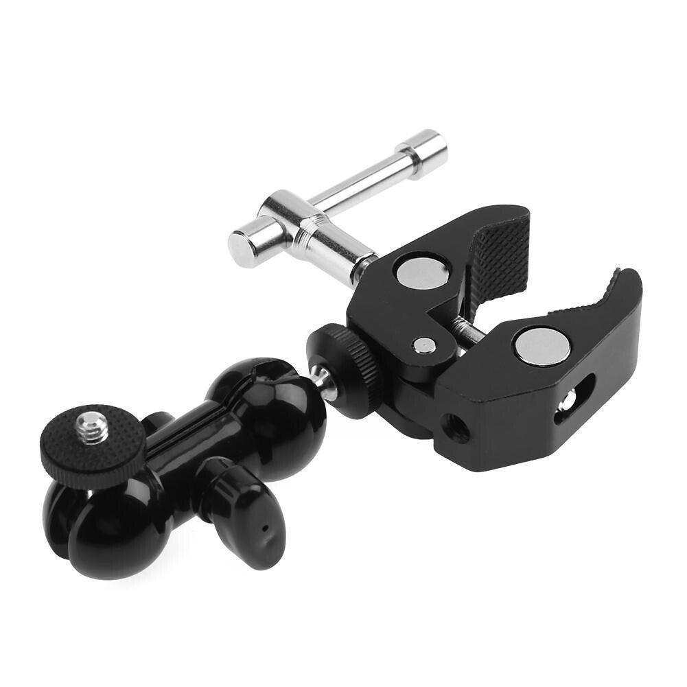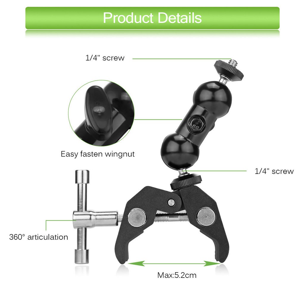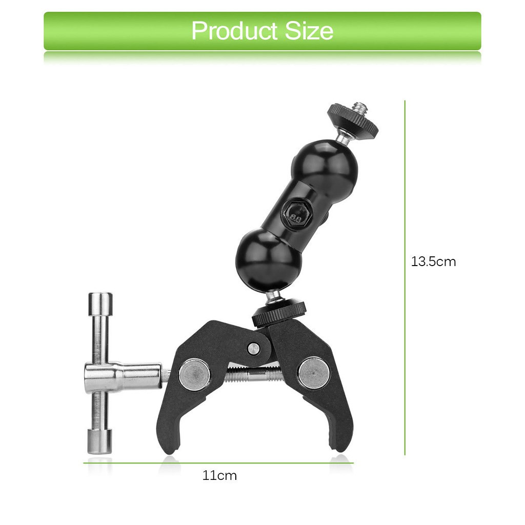 Siêu kẹp kèm mini ball cho màn hình quay phim là một đầu Ball đa chức năng Double Ball với kẹp dưới và vít 1/4 ", các kẹp kẹp mở đến 5.2cm