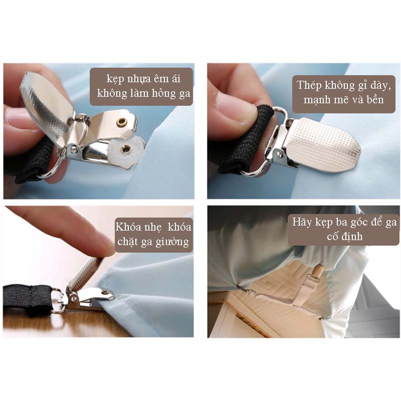 - 4 chiếc kẹp gắn ở 4 đầu ga đệm sẽ giúp giữ ga luôn ở vị trí cố định, không bị xê dịch.