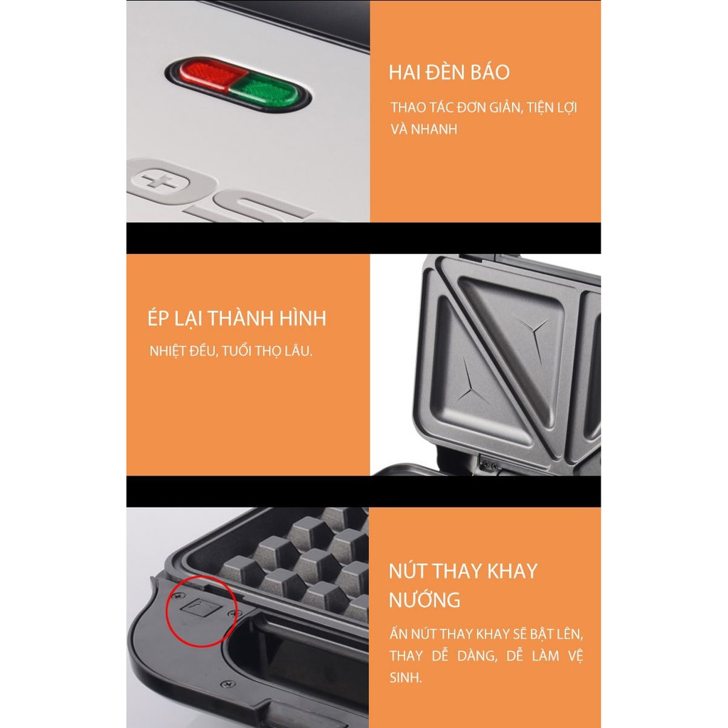 Có 3 chức năng: Nướng bánh Sandwich, Bánh mỳ kẹp, Bánh waffle
