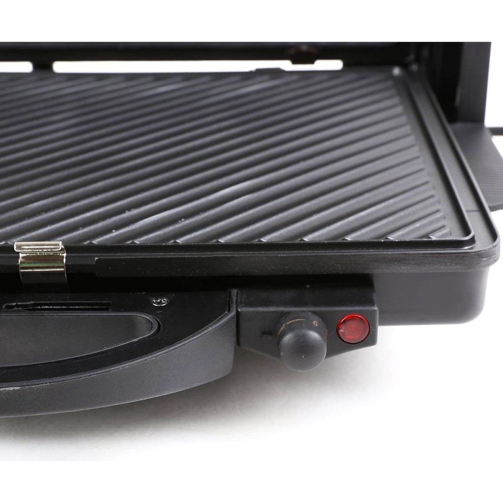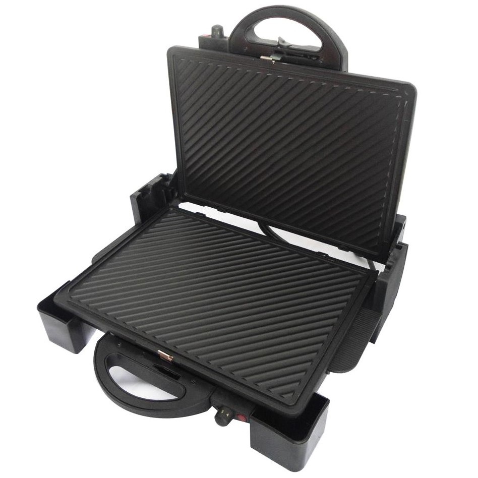 - Hai mặt nướng riêng biệt: Vỉ nướng điện đa năng Tiross TS965 chính hãng có hai mặt nướng nên có thể nướng được nhiều thức ăn hơn; mỗi mặt đều có nút điều chỉnh nhiệt độ riêng. 2 mặt có thể gập lại và có khóa chốt an toàn, rất tiện lợi khi bạn làm hay nướng bánh mì sandwich và cũng giúp tiết kiệm diện tích, dễ dàng bảo quản.
