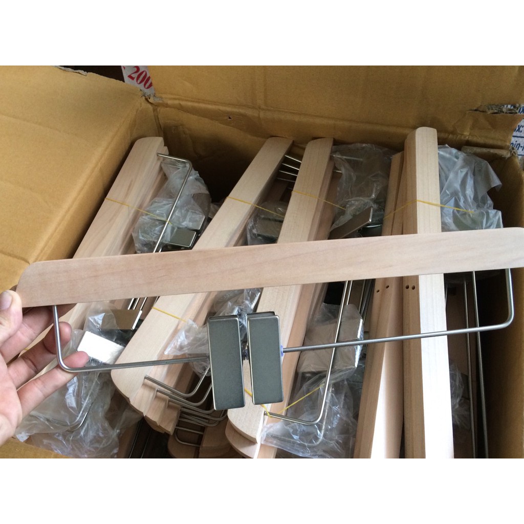 Giới thiệu kẹp quần bằng gỗ mộc có thanh ngang, móc kẹp quần,chân váy có thanh ngang đầu kẹp mạ vàng, kẹp quần áo,chân váy