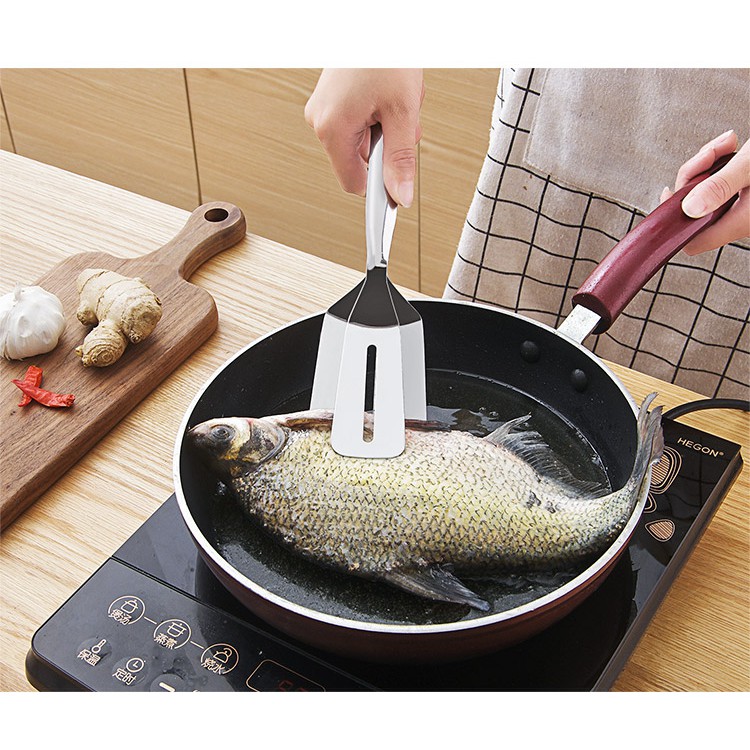 ⚜️Chất liệu: thép không gỉ 201 hoặc 304, siêu bền, chống ăn mòn cao, không bong tróc chuyên dùng cho các vật dụng bếp gia đình, có khả năng chịu nhiệt cao.⚜️ Thiết kế kẹp chuyên dụng giữ chặt thức ăn ở giữa, phần xẻng mỏng có rãnh dễ dàng lật, trở mặt các món chiên xào rán một cách nhanh chóng trong quá trình chế biến như chiên cá, chiên trứng, bánh, bít tết, pizza, khoai tây, chả giò…