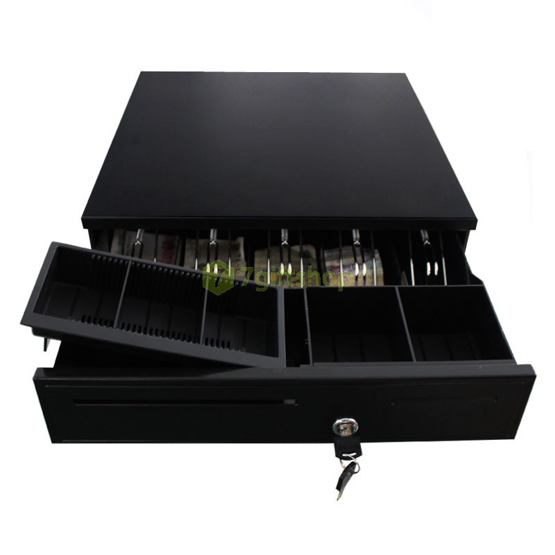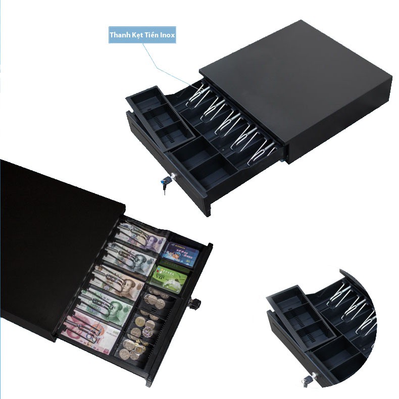 Sản phẩm két đựng tiền có 5 ngăn đựng tiền mặt, 2 ngăn đựng tiền xu, 1 ngăn 2 tầng đựng đồ linh tinh. Sản phẩm có thể kết nối với máy in đẩy hộp tiền ra khi thanh toán. Hoặc sử dụng chìa khóa để mở tủ.