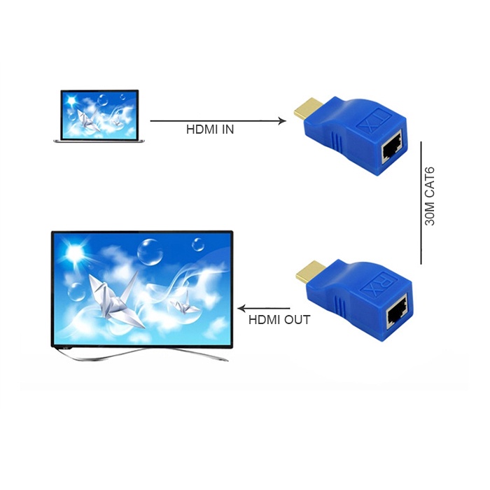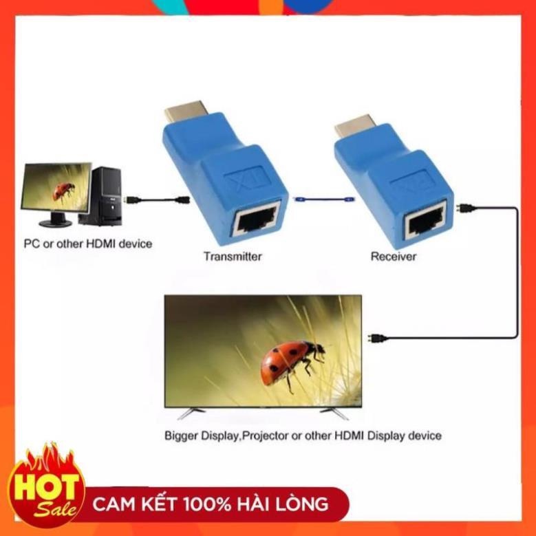 Bộ chuyển đổi nối dài HDMI thông qua dây Lan. Max 30mThay vì dùng dây HDMI 30m, quý khách có thể thay bằng dây LAN. Nên dùng dây LAN Cat 6 trở lên để có tín hiệu tốt nhất và lên hình được.