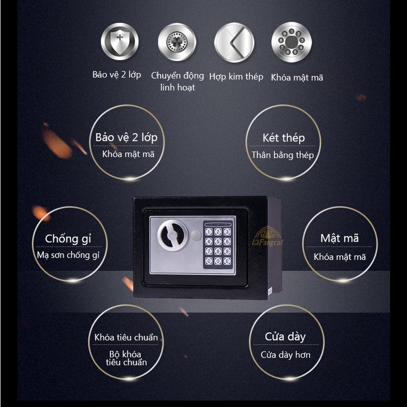 Lưu ý: có đinh vít và lỗ khoan chờ sẵn phía sau, thích hợp để bắt vít cố định két vào tường, ngăn tủ,... tránh bị kẻ gian di chuyển két ra chỗ khác.