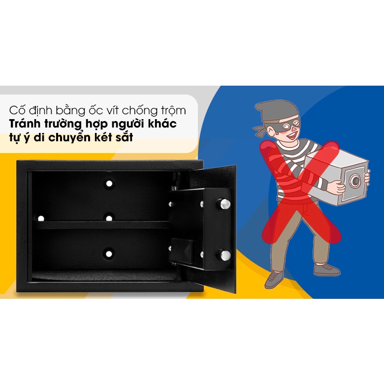 - Khoá số tuỳ chọn mã, có kèm theo mã dự phòng ghi đè trong trường hợp mất mã khoá, có màn hình hiển thị LED, có sẵn có lỗ bắt vít cố định két xuống sàn chống trộm.