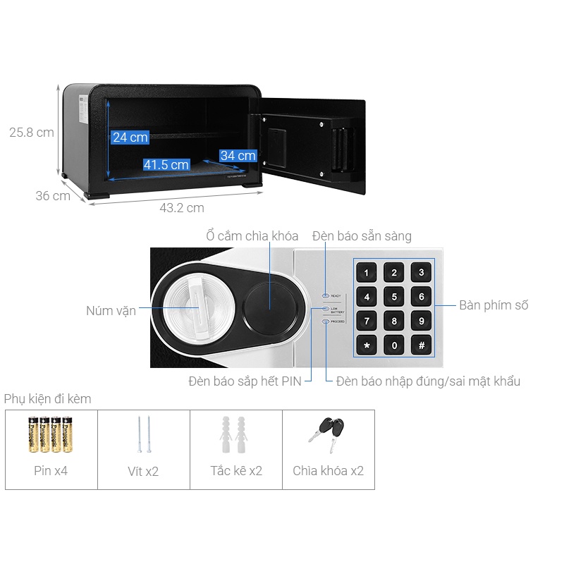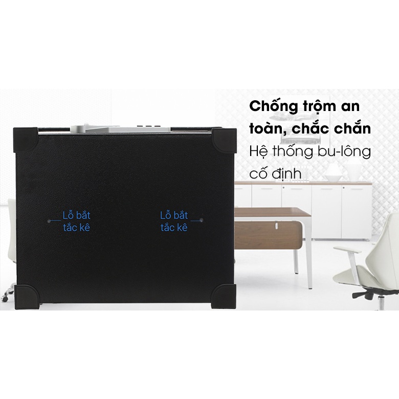 - Khoá điện tử số tuỳ chọn mã, có kèm theo mã dự phòng ghi đè trong trường hợp mất mã khoá, có sẵn có lỗ bắt vít cố định két xuống sàn chống trộm, chống nạy phá.