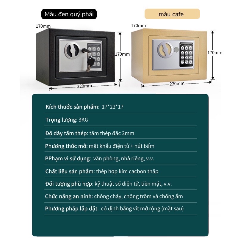 Két sắt mini điện tử an toàn mẫu mới nhất 17E, dùng để đồ cá nhận hay các cửa hàng để tiền vào két sắt.Két chất liệu hợp kim được sơn tĩnh điện màu sắc đẹp bắt mắt, bền đẹp, hợp với không gian hiện đại sang trọng. có thể để cho các bạn tiết kiêm các khoản chi tiêu nho nhỏ xinh xinh