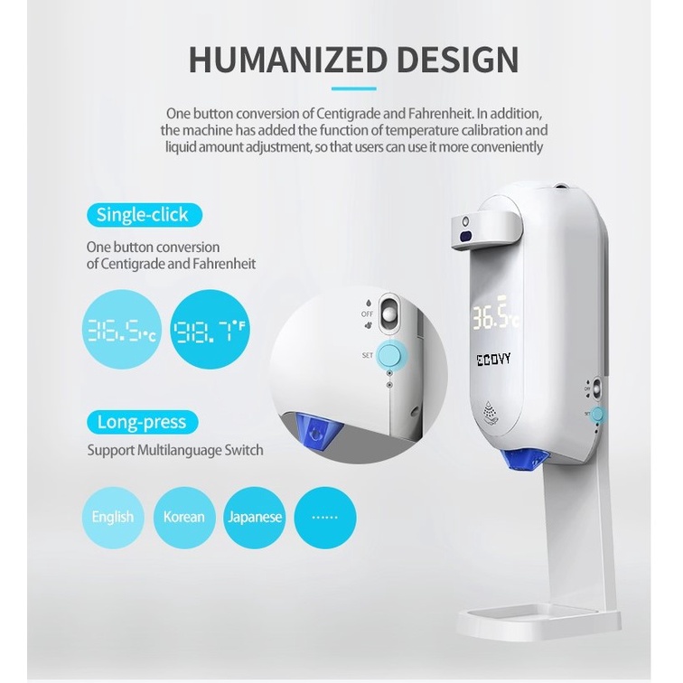 Máy rửa tay sát khuẩn cảm ứng ECOVY Model L5 Plus có đo nhiệt độ trán và tay, thích hợp lắp đặt ở nhiều nơi: Bệnh viện, trường học, trung tâm đào tạo, văn phòng, trung tâm thương mại, thang máy tòa nhà, nhà xưởng, nơi đông người, …. Tiện lợi sử dụng, dễ dàng lắp đặt, bảo vệ bạn khỏi các loại vi khuẩn, virus gây bệnh.ECOVY L5 Plus Khắc phục các nhược điểm của các dòng máy K9, K9 Pro, K9 Pro Max, K10 pro (rất dễ hư hỏng).