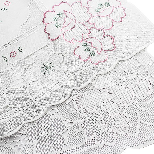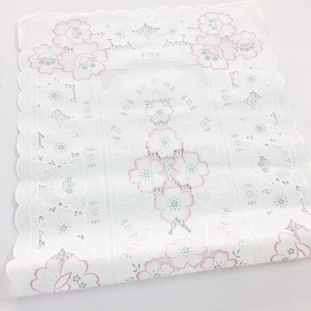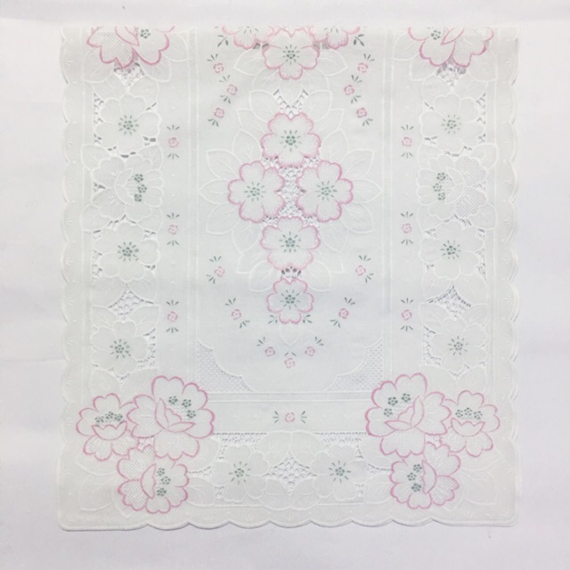 - Khăn bàn có hình chữ nhật đơn giản nhưng vô cùng bắt mắt nhờ họa họa tiết hoa màu trắng, hồng trang nhã, nổi bật trên nền trắng, góp phần tô điểm thêm cho chiếc bàn xinh xắn của gia đình bạn.