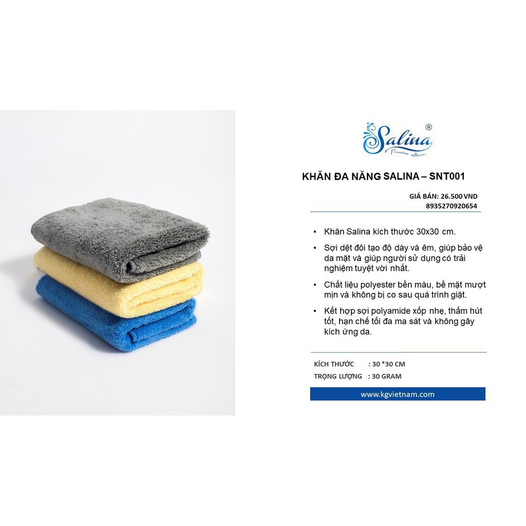 Giới thiệu Khăn đa năng 30*30cm Salina cao cấp SNT001 polyeste kết hợp polyamide xốp nhẹ, bền màu, thấm nước, kháng khuẩn, mềm mịn