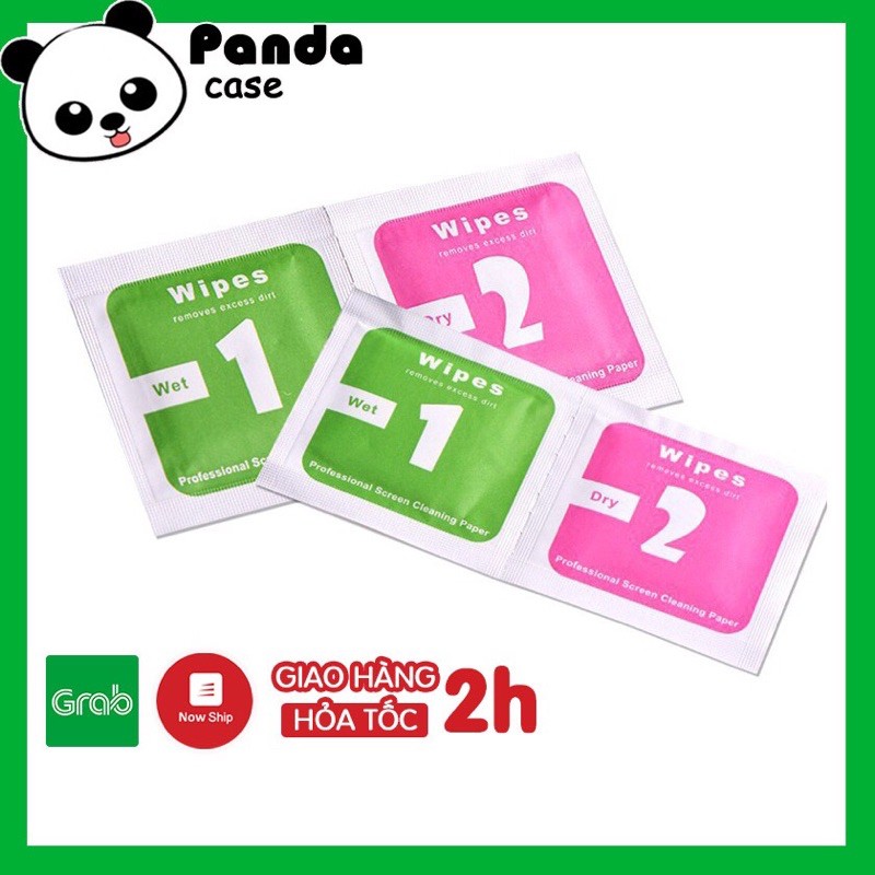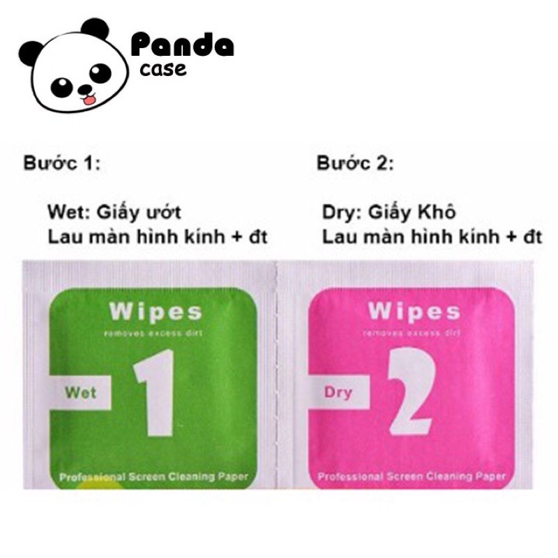 Set gồm 2 miếng giấy số 1 và số 2 lần lượt là giấy ướt và giấy khô, có tác dụng làm sạch mọi vết bẩn trên màn hình điện thoại trước khi dán kính cường lực