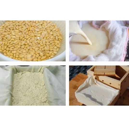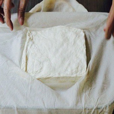 Đậu sau khi kết tủa và tách nước vẫn còn nóng hổi được xúc ra và đổ vào khuôn đậu phụ (khuôn đã được lót sẵn khăn bên dưới). Bạn gấp các mép khăn vuông vắn để miếng đậu đẹp và phẳng hơn, và bắt đầu ép đậu phụ.Đậu được gói trong chiếc khăn gói đậu này sẽ vào khuôn một cách vuông vắn, không bám dính và nhanh ráo nước.